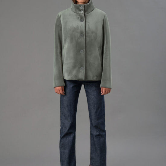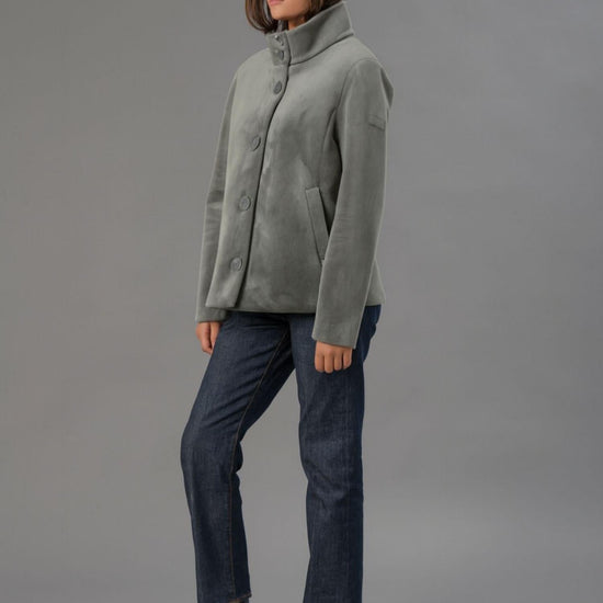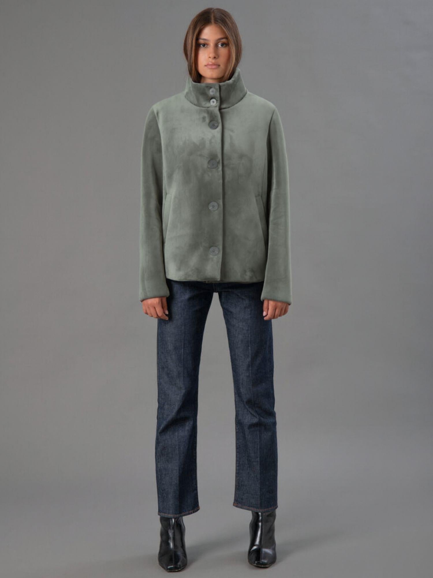 Giubbino corto realizzato in velluto liscio stretch accoppiato a jersey nero, pensato per offrire un perfetto equilibrio tra eleganza e comfort. Il collo alto e i bottoni piatti logati cuciti a filo donano un tocco sofisticato, mentre le tasche a filetto aggiungono praticità e stile. La vestibilità regular valorizza la silhouette senza rinunciare alla comodità, rendendolo ideale per completare look moderni e raffinati. Tessuto: 95% poliestere, 5% elastan.