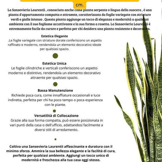 La Sansevieria Laurentii da 130 cm è la scelta ideale per chi cerca una pianta d'arredo imponente e di facile gestione. Con le sue foglie verticali e variegate, questa pianta aggiunge un tocco di eleganza e modernità a qualsiasi ambiente. Perfetta per interni ampi, la Sansevieria Laurentii è apprezzata per la sua resistenza e la capacità di purificare l'aria.