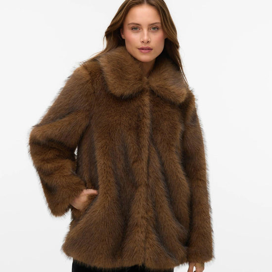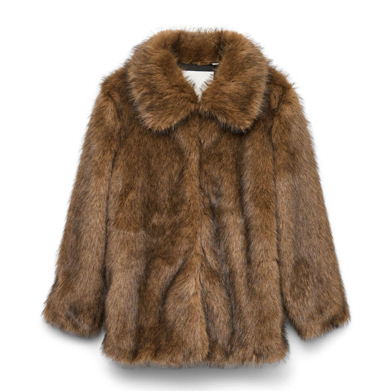 Giacca in finta pelliccia dal design raffinato e senza tempo, perfetta per aggiungere un tocco di eleganza a qualsiasi outfit. Morbida e confortevole, è ideale sia per look quotidiani che per occasioni speciali. Presenta colletto alla francese, maniche lunghe, chiusura con gancio e occhiello e pratiche tasche laterali. Foderata in poliestere per garantire comfort e calore. Composizione: 50% poliestere, 50% poliestere riciclato.