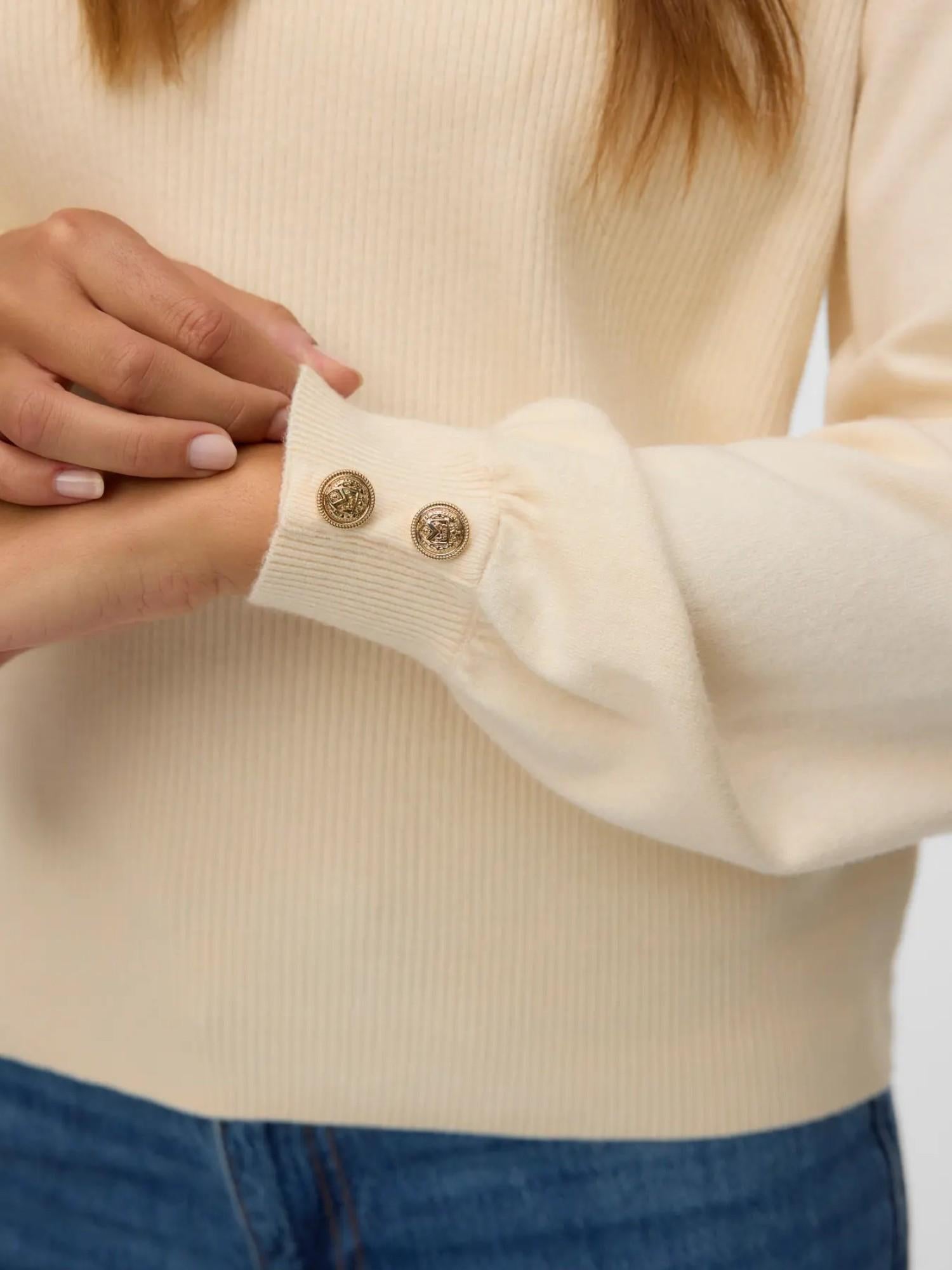 Pullover lavorato a maglia dal design classico e raffinato, perfetto per aggiungere comfort e stile al tuo guardaroba. Realizzato in morbida viscosa Livaeco by Birla Cellulose, poliestere e nylon, offre una vestibilità regolare che garantisce calore e comodità. Il girocollo, le maniche lunghe, i polsini a coste e il dettaglio con bottoni aggiungono un tocco elegante e femminile. Composizione 50% viscosa Livaeco by Birla Cellulose, 28% poliestere, 22% nylon.