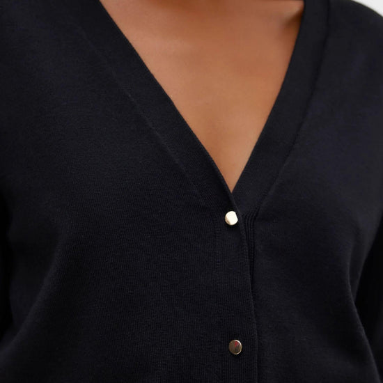 Cardigan leggero con scollo a V dal design versatile e contemporaneo, perfetto come strato extra per completare e valorizzare ogni look. Dotato di chiusura a bottoni, maniche lunghe e polsini a coste, può essere indossato da solo o sopra una t-shirt per uno stile casual e disinvolto. La vestibilità loose fit assicura comfort naturale e libertà di movimento, ideale con jeans o gonne per un tocco elegante e moderno. Composizione 77% viscosa LENZING ECOVERO, 23% poliestere.