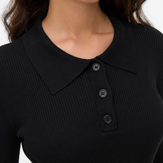 Pullover con collo polo dal design elegante e aderente, perfetto per unire comfort e stile in ogni occasione. Realizzato in morbida viscosa LENZING ECOVERO e poliestere riciclato, offre una vestibilità tight fit che valorizza la silhouette senza rinunciare alla comodità. Le maniche lunghe, i polsini a coste e la chiusura con bottoni aggiungono un tocco raffinato e moderno. Composizione 77% viscosa LENZING ECOVERO, 23% poliestere riciclato.