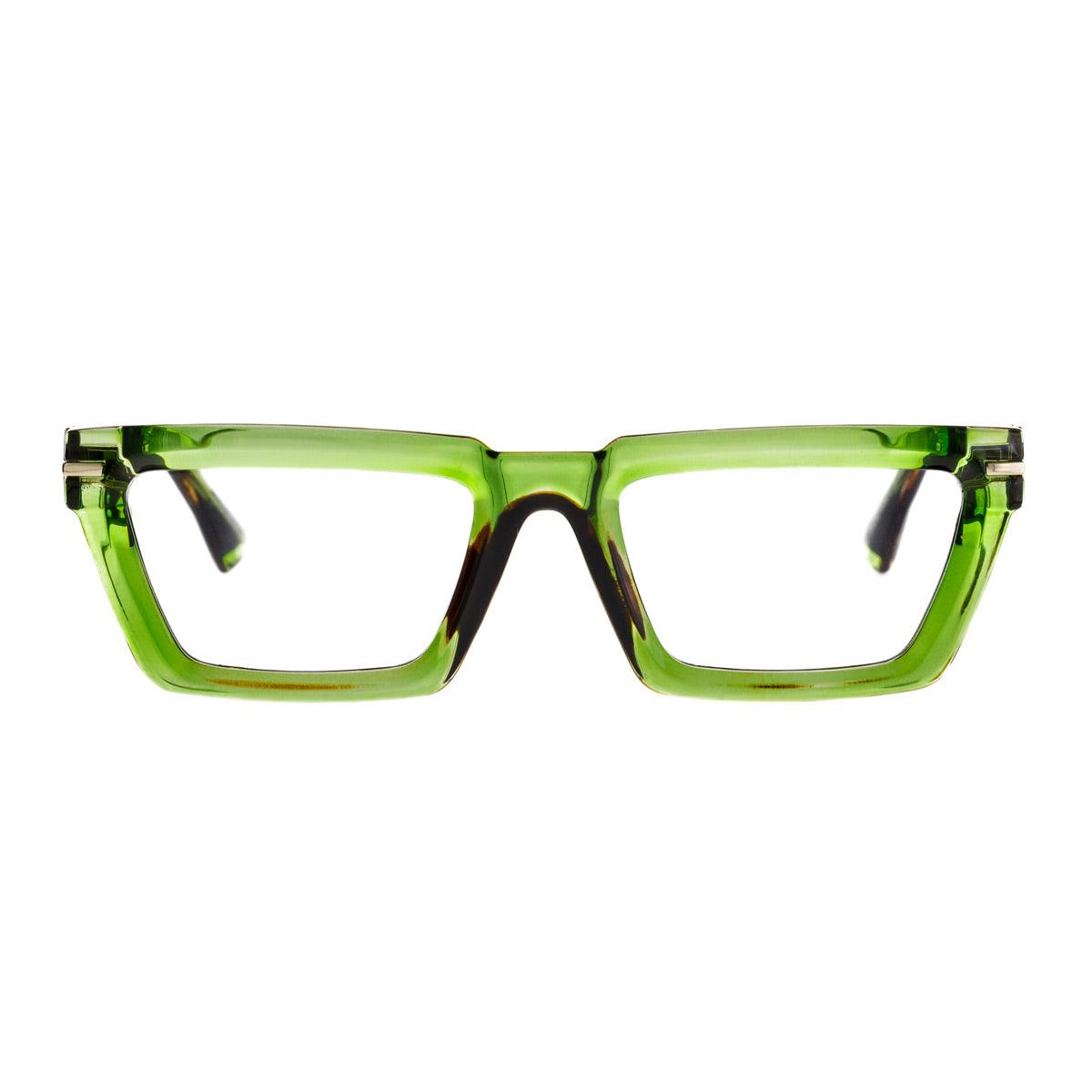 La montatura bold con spessori importanti si distingue per l’anima metallica a vista incastonata nelle aste – un dettaglio tecnico e stilistico che esalta la qualità e il design d’avanguardia. Il frontale verde trasparente, abbinato a un top color avana e a un back in tinta, crea un sofisticato gioco cromatico ispirato ai toni della natura.