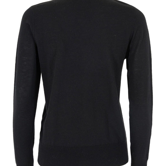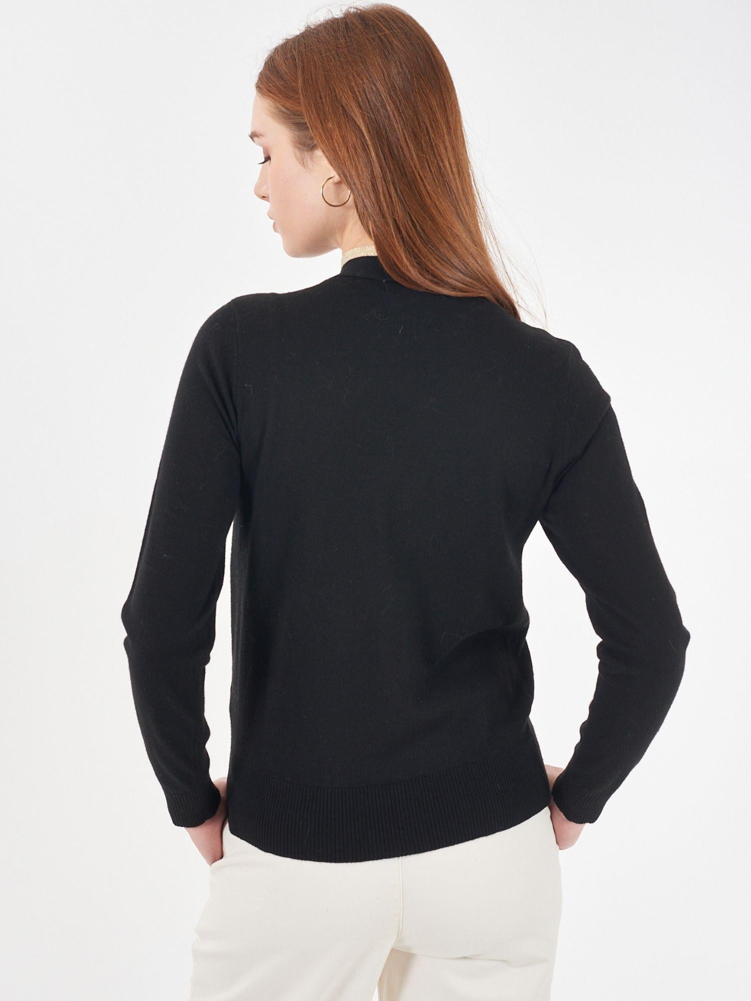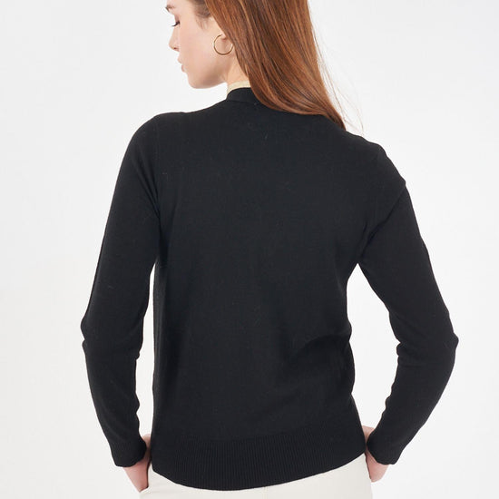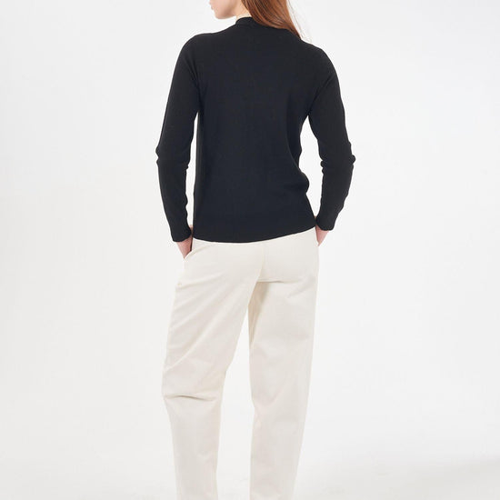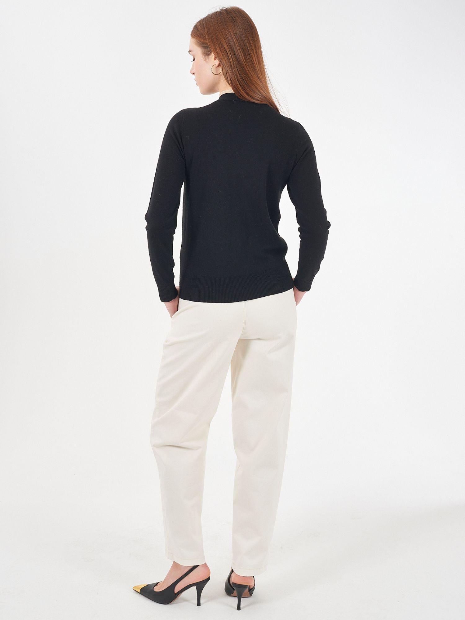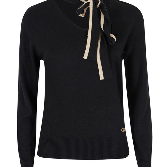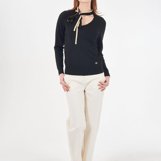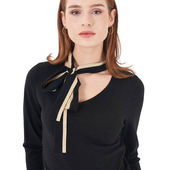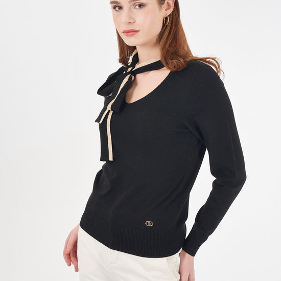 Maglia donna scollo ampio con fiocco, maniche lunghe polsini e vita a coste. 35% Nylon 33% Acrilico 32% Lana